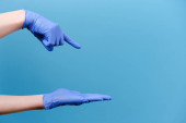 Zdjęcie "Zbliżenie nierozpoznawalny młody człowiek zginać ręka palec szybko, nosić medyczny ochronny rękawiczka, odizolowany na błękitny studio tło z kopia przestrzeń dla reklama. Żegnaj geście. Pożegnalna koncepcja" może być wykorzystywane do celów osobistych i komercyjnych zgodnie z warunkami zakupionej licencji Royalty-free. Obraz jest dostępny do pobrania w jakości wysokiej rozdzielczości do 5760x3840.