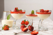 Szklanka tradycyjnego włoskiego budyniu kremowego panna cotta z miętą pieprzową, dżemem truskawkowym, świeże truskawki, zbliżenie