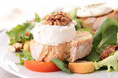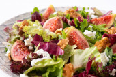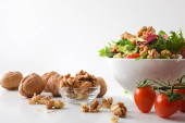Sałatka śródziemnomorska z orzechami włoskimi w misce z pomidorami sałatowymi, cebulą i oliwą z oliwek na białym stole odizolowanym tle. Widok z przodu.