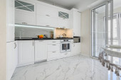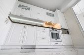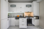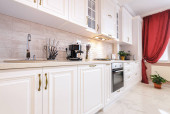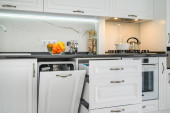 Zdjęcie "Luksusowe białe nowoczesne wnętrze kuchni" może być wykorzystywane do celów osobistych i komercyjnych zgodnie z warunkami zakupionej licencji Royalty-free. Obraz jest dostępny do pobrania w jakości wysokiej rozdzielczości do 5760x3840.