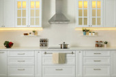 Eleganckie wnętrze kuchni z nowoczesną kuchenką i stylowymi meblami