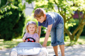 Zdjęcie "Dwoje szczęśliwych dzieci bawiących się dużym starym samochodzikiem w letnim ogrodzie, na świeżym powietrzu. Chłopak tankuje samochód z małą dziewczynką, uroczą siostrą w środku. Chłopiec za pomocą węża ogrodowego i wypełnić benzyną, rodzeństwo" może być wykorzystywane do celów osobistych i komercyjnych zgodnie z warunkami zakupionej licencji Royalty-free. Obraz jest dostępny do pobrania w jakości wysokiej rozdzielczości do 5760x3840.