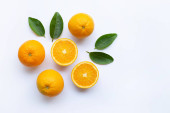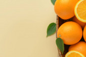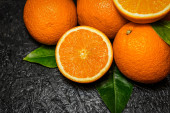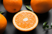 Świeże pomarańcze z zielonymi liśćmi na ciemnym tle