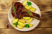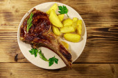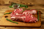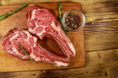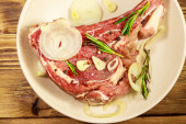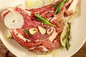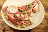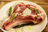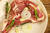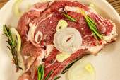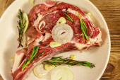 Marynowany stek z żeberek wołowych na kostce z przyprawami, cebulą i rozmarynem na drewnianym stole