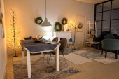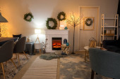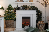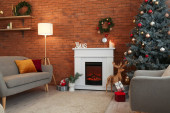 Wnętrze nowoczesnego pokoju z kominkiem urządzone na Boże Narodzenie