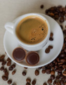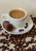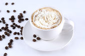 Piękne latte macchiato z pianką mleczną w białym kubku z ziarnem kawy w pobliżu. Ciemnoniebieskie tło. Filiżanka kawy z mlekiem. Gorące latte lub Cappuccino przygotowane z mleka z przestrzenią do kopiowania