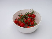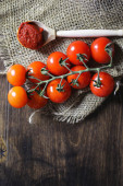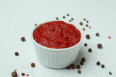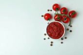 Drewniana miska z pastą pomidorową i pomidorami na białym stole teksturowanym