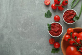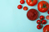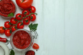 Miska i słoik z pastą pomidorową na białym drewnianym tle ze składnikami