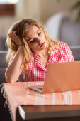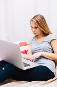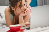 Zmotywowany nastolatek leżący na łóżku rozwiązujący zadania i mający zajęcia online z domu z powodu globalnej pandemii koronawirusowej.