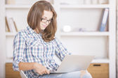 Szczęśliwa blondynka student z aparatem ortodontycznym o zabawne przyjemne klasy online z domu ze względu na pandemię.