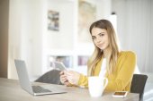 Zdjęcie "Szczęśliwa blondynka student z aparatem ortodontycznym o zabawne przyjemne klasy online z domu ze względu na pandemię." może być wykorzystywane do celów osobistych i komercyjnych zgodnie z warunkami zakupionej licencji Royalty-free. Obraz jest dostępny do pobrania w jakości wysokiej rozdzielczości do 5760x3840.