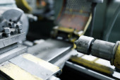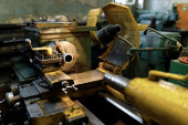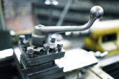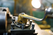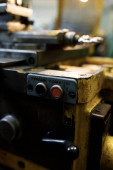 Stare tokarki ślusarskie, komponenty i narzędzia. Tokarka z bliska, metal z zamazanym tłem.