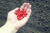 Kobiety farmerki zrzucają ziarna grochu na ziemię. Groch nasadzeniowy