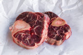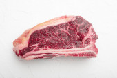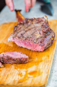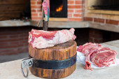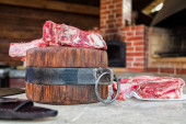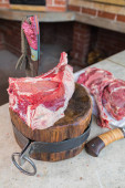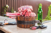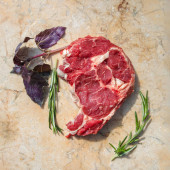 Świeży kawałek wołowiny z żeberkami, gotowy do pieczenia. W pobliżu znajdują się przyprawy rozmarynu. Na desce do krojenia kamieni