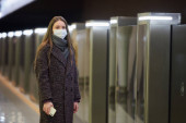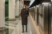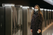 Kobieta w masce medycznej, aby uniknąć rozprzestrzeniania się koronawirusu, czeka na pociąg na peronie metra. Dziewczyna w masce chirurgicznej trzyma dystans społeczny w podziemiu.