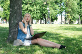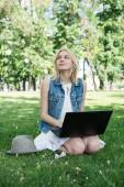 atrakcyjna kobieta korzysta z laptopa w parku leży