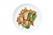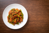 mieszać smażone plasterki włóczki długiej fasoli z sosem curry kurczaka na talerzu