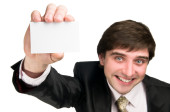 biznesmen w garniturze gospodarstwa puste karty fotografowania w studiu.