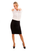 biznes kobieta trzyma pliku przez jej ciało na zwykłym białym tle