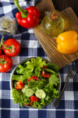 sałatki ze świeżych pomidorów wiśniowych, mozzarelli, bazylii i innych warzyw na stole obiadowym