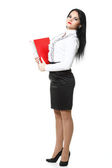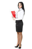 biznes kobieta w czarną spódnicę i białą bluzkę prowadzenie różowy folder