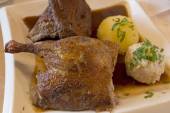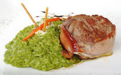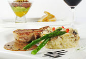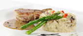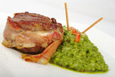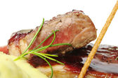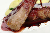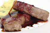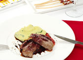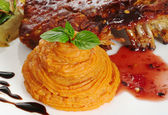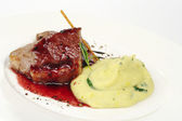 danie główne: mięso z czerwonego pieprzu i puree z ziemniaków (selektywne focus, skupić się na przedniej części mięsa)