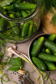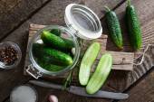 Tło żywnościowe. Ogórki z czosnkiem, solą, koperkiem i pustym szklanym słoikiem do marynowania na starej drewnianej powierzchni. Widok z góry