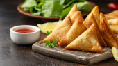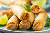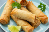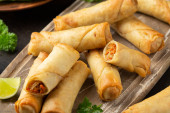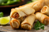 Smażone sajgonki warzywne ze słodkim chili i sosem sojowym na drewnianej desce