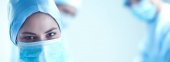 Azjatki i Arabki młoda piękna kobieta profesjonalne pielęgniarki w masce medycznej i mundur stojąc razem w centrum medycznym w pracy patrząc na aparat w dobrym nastroju. Pandemia koronawirusa, zbliżenie