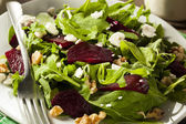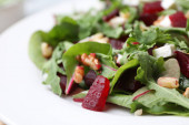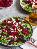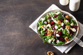 Sałatka buraczana lub buraczana ze świeżą rukolą, miękki ser i orzechy włoskie na talerzu, opatrunek i przyprawy na ciemnym drewnianym tle, przestrzeń do kopiowania, widok z góry /
