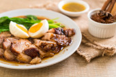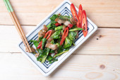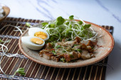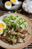 Słonecznik smażony z chrupiącą wieprzowiną z gotowanym jajkiem i ryżem na parze