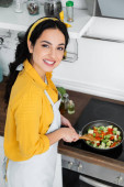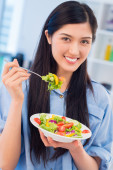 wesoła młoda kobieta trzyma widelec z pomidorem wiśniowym w pobliżu sałatki w misce