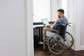 niepełnosprawny mężczyzna pracujący na sofie z laptopem w pobliżu wózka inwalidzkiego na pierwszym planie