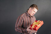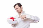 młody człowiek posiadający Dar valentine w ręku. on jest dawanie to ktoś. na białym tle.