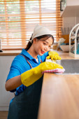 Uśmiechnięta gospodyni domowa sprzątająca blat kuchenny gąbką i detergentem