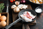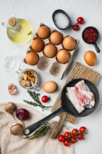 Śniadanie jajko składniki mix, na starym ciemnym drewnianym tle tabeli, widok z góry płaskie układanki