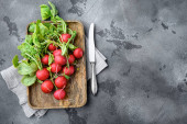 Świeża rzodkiewka, rustykalne tło. Zestaw naturalnych produktów ekologicznych, na czarnym drewnianym tle stołu, widok z góry płaski leżak, z miejsca na tekst