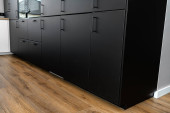 Nowoczesny kominek z zamkniętą komorą spalania stojącą w salonie, pomalowany na czarno, z taflą narożną pokrytą sadzą.