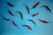 Czerwona papryka chilli wzór na niebieskim tle. Widok z góry.