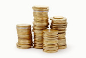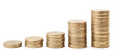 Monety ułożone w kolumny o różnych wysokościach z bliska na białym tle. Izolacja