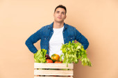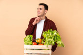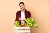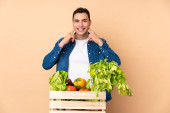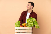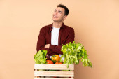 nastoletni rolnik ze świeżo zebranymi warzywami w pudełku ze śmiechem
