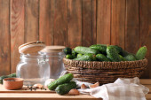 Zdjęcie "Tło żywnościowe. Ogórki z czosnkiem, solą, koperkiem i pustym szklanym słoikiem do marynowania na starej drewnianej powierzchni. Widok z góry" może być wykorzystywane do celów osobistych i komercyjnych zgodnie z warunkami zakupionej licencji Royalty-free. Obraz jest dostępny do pobrania w jakości wysokiej rozdzielczości do 5760x3840.