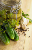 Tło żywnościowe. Ogórki z czosnkiem, solą, koperkiem i pustym szklanym słoikiem do marynowania na starej drewnianej powierzchni. Widok z góry