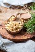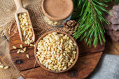 Zdjęcie "Orzechy sosny w misce, szyszka, gałąź, szklany słoik na desce do krojenia. Martwa natura z naturalnych składników, widok z boku." może być wykorzystywane do celów osobistych i komercyjnych zgodnie z warunkami zakupionej licencji Royalty-free. Obraz jest dostępny do pobrania w jakości wysokiej rozdzielczości do 5760x3840.