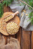 Orzechy sosny w misce, szyszka, gałąź, szklany słoik na desce do krojenia. Martwa natura z naturalnych składników, widok z boku.