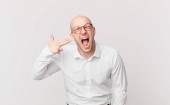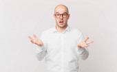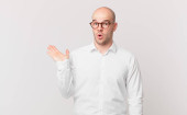 Zdjęcie "łysy mężczyzna czuje się szczęśliwy, podekscytowany, zaskoczony lub zszokowany, uśmiechnięty i zdumiony czymś niewiarygodnym" może być wykorzystywane do celów osobistych i komercyjnych zgodnie z warunkami zakupionej licencji Royalty-free. Obraz jest dostępny do pobrania w jakości wysokiej rozdzielczości do 5760x3840.