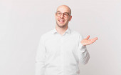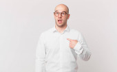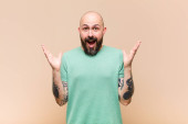 łysy mężczyzna czuje się szczęśliwy, podekscytowany, zaskoczony lub zszokowany, uśmiechnięty i zdumiony czymś niewiarygodnym
