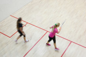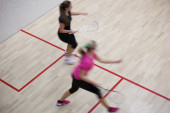 Dwóch zawodników squasha kobiet w szybkiej akcji na kort do squasha (moti