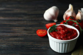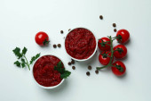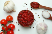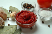 Zdjęcie "Drewniana miska z pastą pomidorową i składnikami na białym tle, miejsce na tekst" może być wykorzystywane do celów osobistych i komercyjnych zgodnie z warunkami zakupionej licencji Royalty-free. Obraz jest dostępny do pobrania w jakości wysokiej rozdzielczości do 5760x3840.