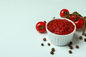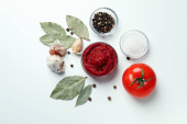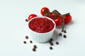 Drewniana miska z pastą pomidorową i składnikami na białym tle, miejsce na tekst